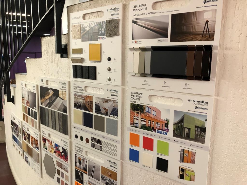 Installée au cœur des établissements, la Matériauthèque Campus présente plus de 300 échantillons produits, chaque échantillon est connecté à la bibliothèque numérique, qui permet un accès facile et rapide aux informations techniques des produits.